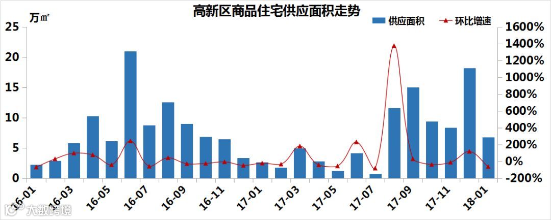 2018年1月份,高新区共新增544套/6.81万㎡商品住宅,供应面积环比跌62.73%。