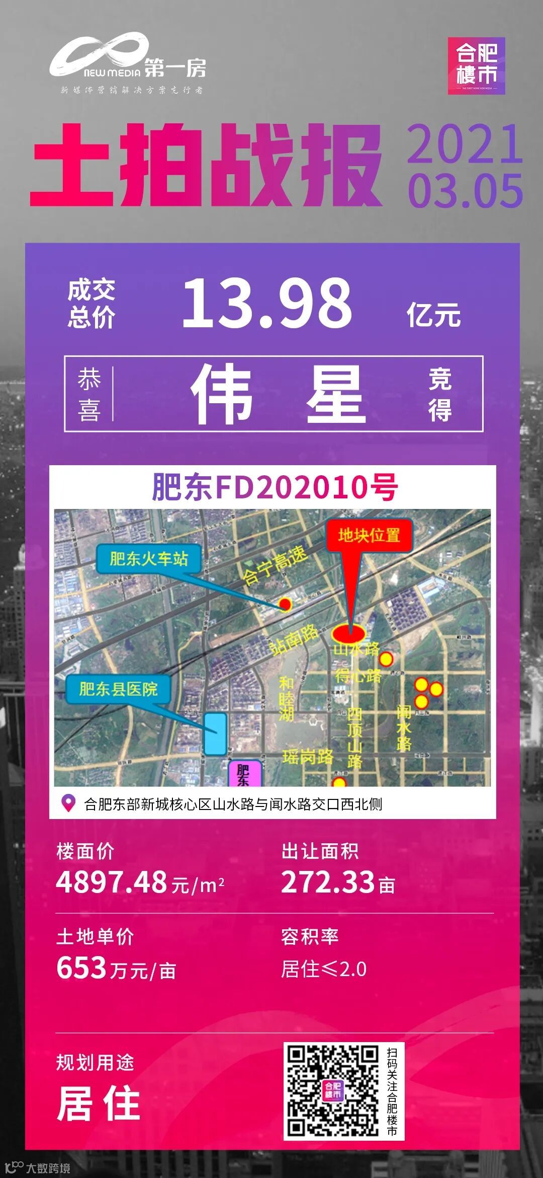 肥东FD202010号地块共有5位竞买人,经过一个多小时的追逐战后,最终伟星夺得,居住用地成交单价653万元/亩,楼面价4897.48 元/平米,商业用地成交单价130 万元/亩,楼面价650.00 元/平米,总价139875.16万元,溢价率30.08%,竞自持面积25400㎡。