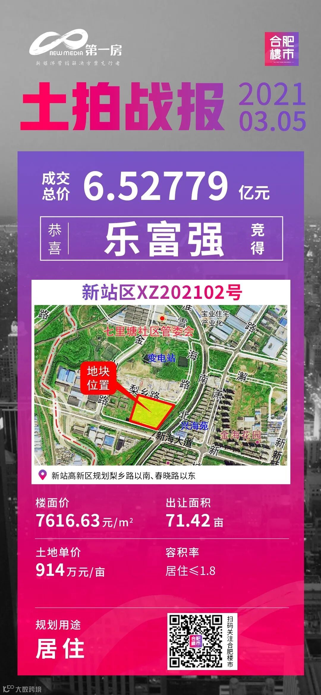 新站区XZ202102居住用地被乐富强夺得,共有19家房企参与竞买,以单价914万元/亩成交,楼面价7616.63元/平米,总价65277.88万元,溢价率28.73%,竞自持面积37400㎡。