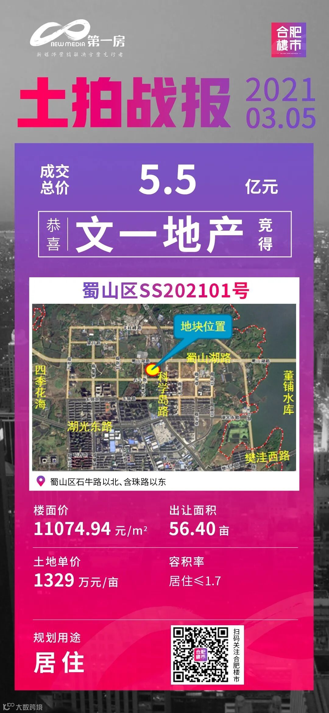 蜀山区SS202101号地块吸引了26家房企参拍,文一以1329万元/亩竞得,总价55126.8万元,居住楼面价11074.94元/㎡,溢价率29.79%,竞自持面积28600㎡。
