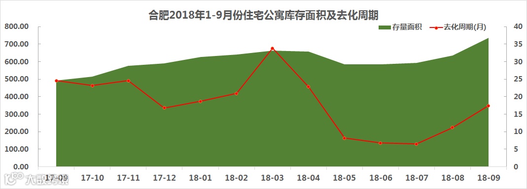 截止2018年9月30日,合肥市的70年公寓可售量为65112套/735.26万㎡ ,环比上涨15.99%。去化周期为17.4个月,较上月增长6.2个月(该数据以备案为准,不排除实际售出、在等备案的房源数据)。