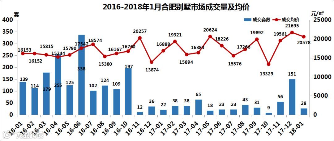 限购后期,合肥别墅市场成交量明显减少,2018年1月合肥共成交别墅28套,成交面积为8997.49㎡,面积同比下跌80.87%。