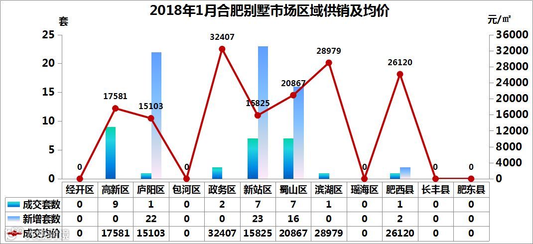 除庐阳区、新站区、蜀山区和肥西县有供应外,其他各区均没有新增别墅上市;其中新增别墅套数前三的区域分别是新站区23套,庐阳区新增22套,蜀山区新增16套别墅。