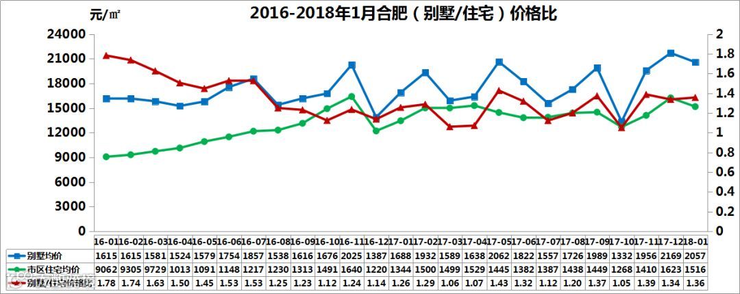 1月合肥别墅/高层的价格比涨至1.36,别墅和市区商品房均价都有所下跌,但是商品房均价下跌幅度更大,所以1月份合肥别墅/住宅价格比有所上涨。