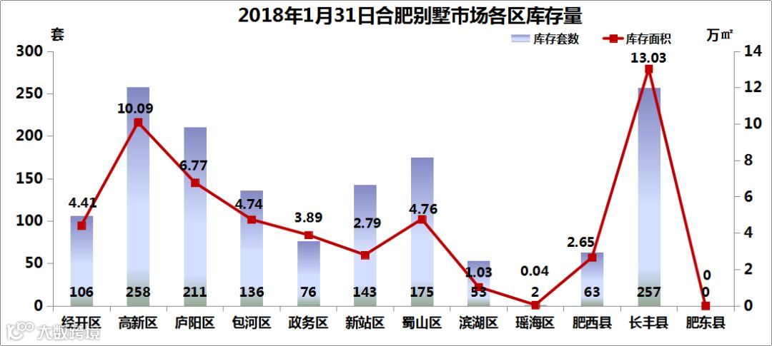 目前,高新区的别墅库存套数最高,为258套,而别墅面积库存最多的区域是长丰县,共计13.03万㎡,肥东县的别墅库存量为0。