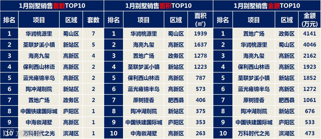 1月蜀山区的华润桃源里以7套/1939㎡的销量夺双料(销售套数和销售面积)冠军;置地广场以4141万元的销量金额居销售额榜首。