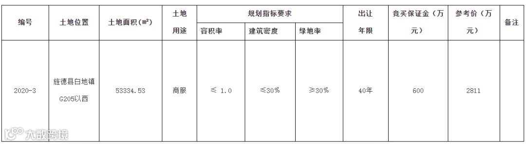 旌德县白地镇2020-3号地块面积约53334平方米,土地用途为商服用地,挂牌时间为3月19日到3月31日。