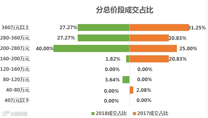 从价格段来看,8月政务区新房成交的总价均在200万元以上;其中总价200-280万元的产品为成交主力,占比为40.00%。