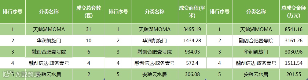2018年1月,天鹅湖ΜΟΜΛ以31套/3495.19㎡、8541.16万元的销售额同时居销售套数、销售面积和销售金额榜首;华润凯旋门居销售套数和销售面积第二,共计10套/1434.28㎡,融创合肥壹号排销售金额第二,销售额共计3161.26万元。