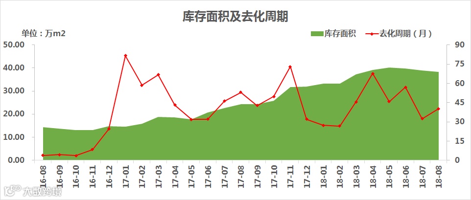 截止2018年8月31日,政务区商品住宅可售量仅2509套/38.21万㎡,库存面积环比下跌1.81%,由于分级备案,实际的库存比这更少;去化周期增加至40.2个月,去化压力大。