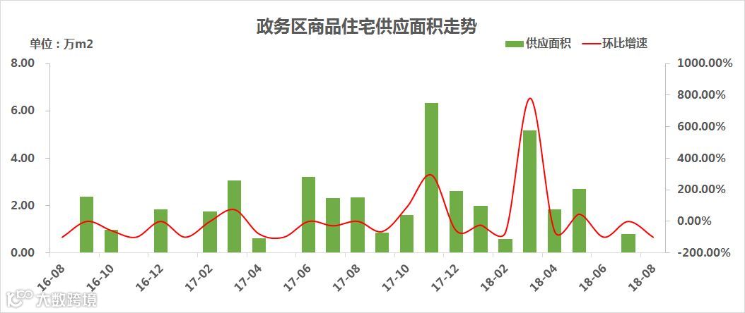 2018年8月份,政务区共新增0套/0万㎡商品住宅,供应面积环比跌100.00%。