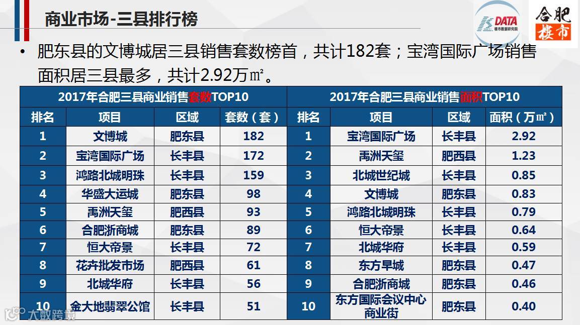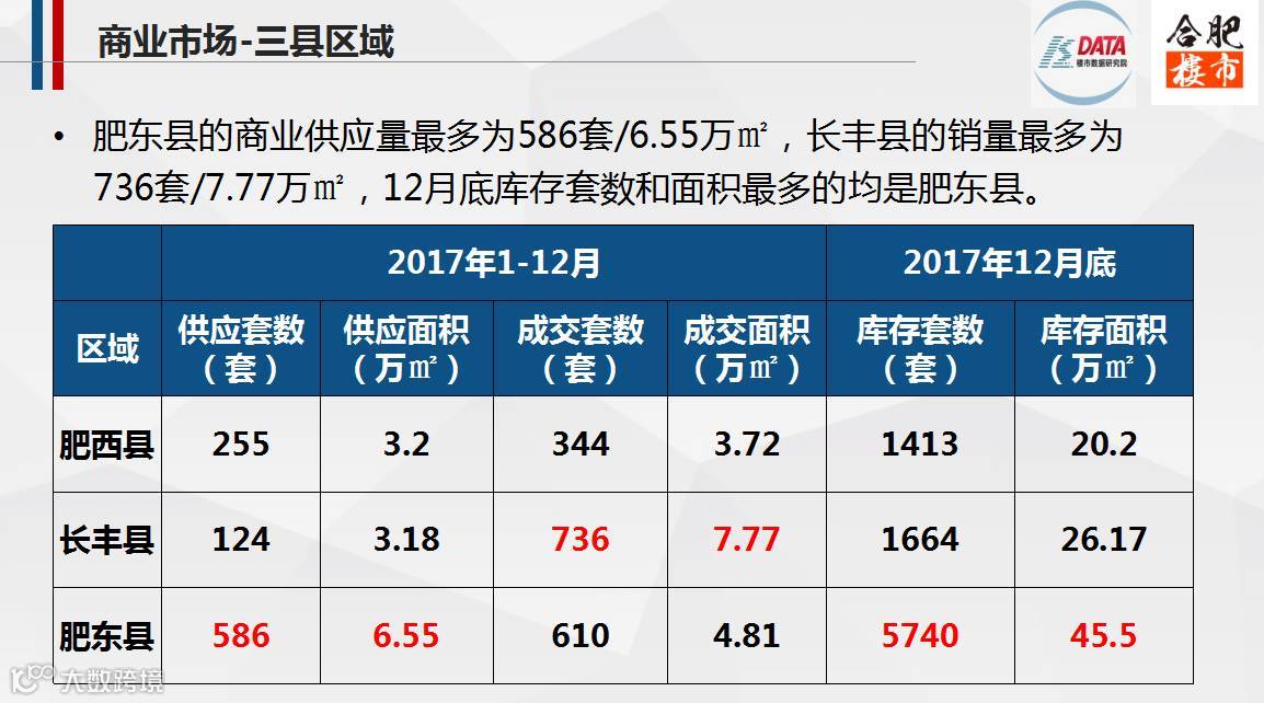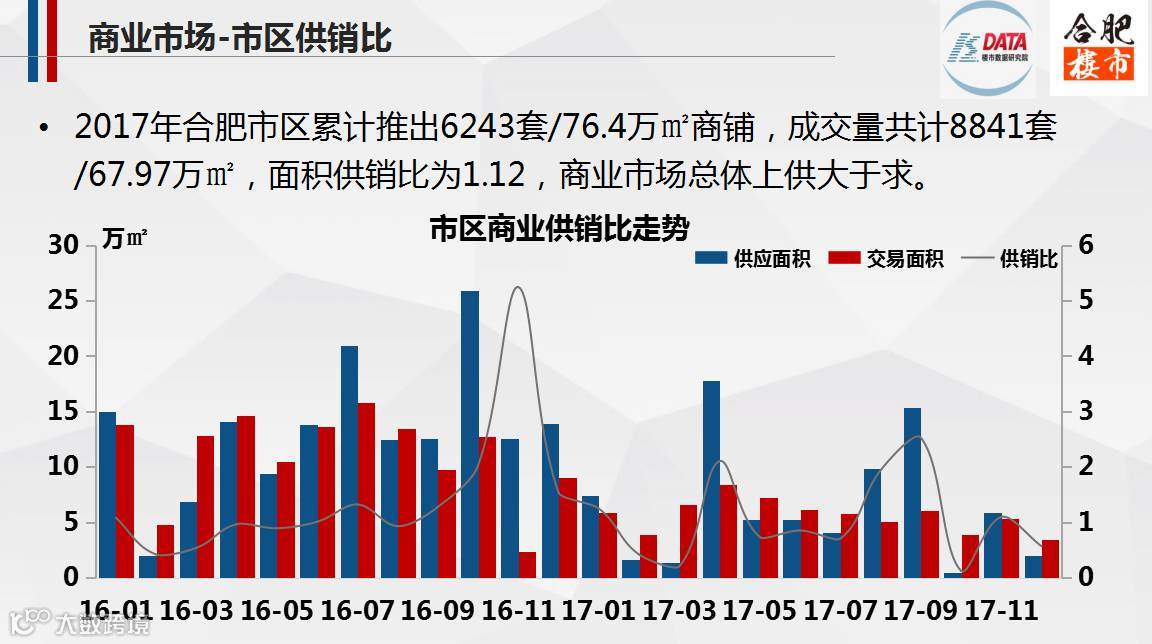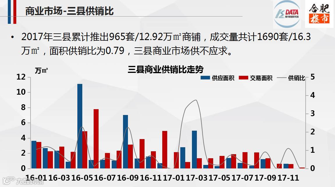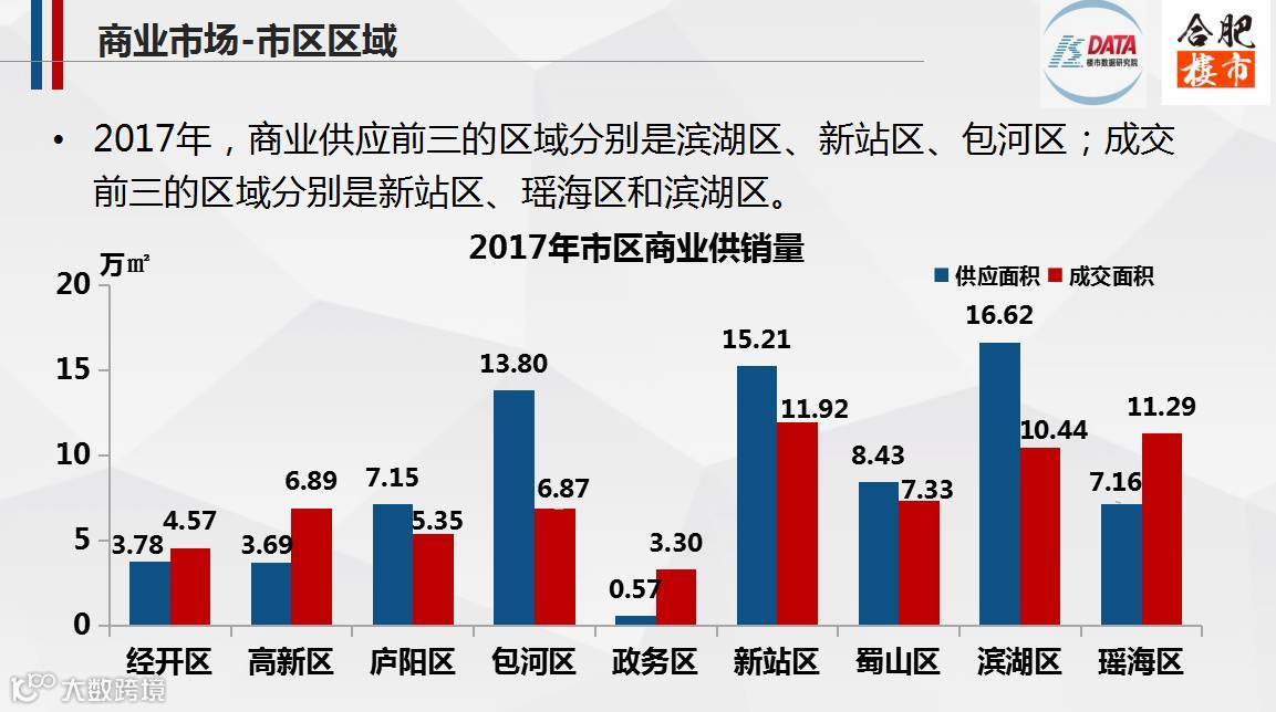 2017,合肥市区商业市场整体供大于求,而三县商业市场供不应求;其中,新站区的京商商贸城商业销量居各区榜首,共计1585套/7.46万㎡,在市区的销量中占比近11%。