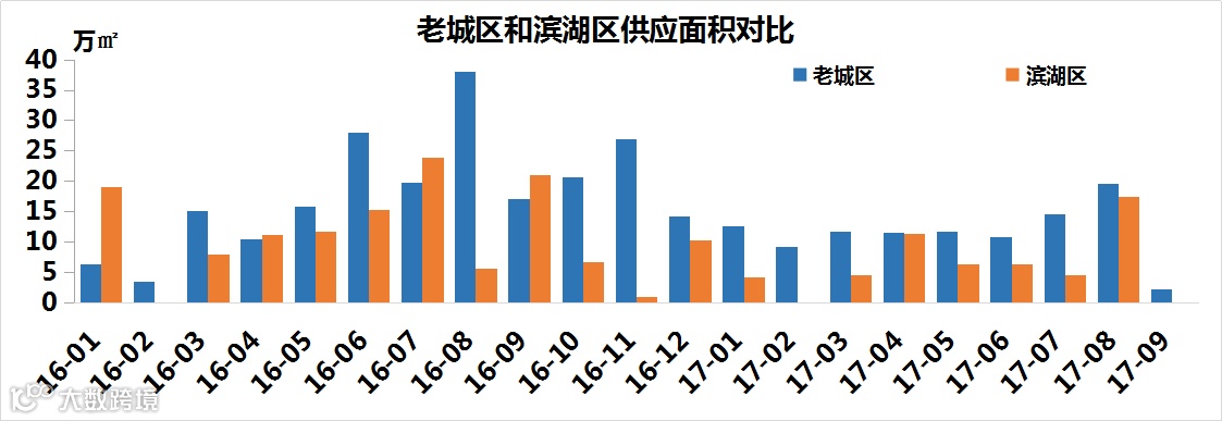 今年1-9月份,老城区的共新增商品住宅10548套/104.1万㎡,而滨湖区新增商品住宅4542套/54.77万㎡,很明显,老城区的新增量远高于滨湖区的。