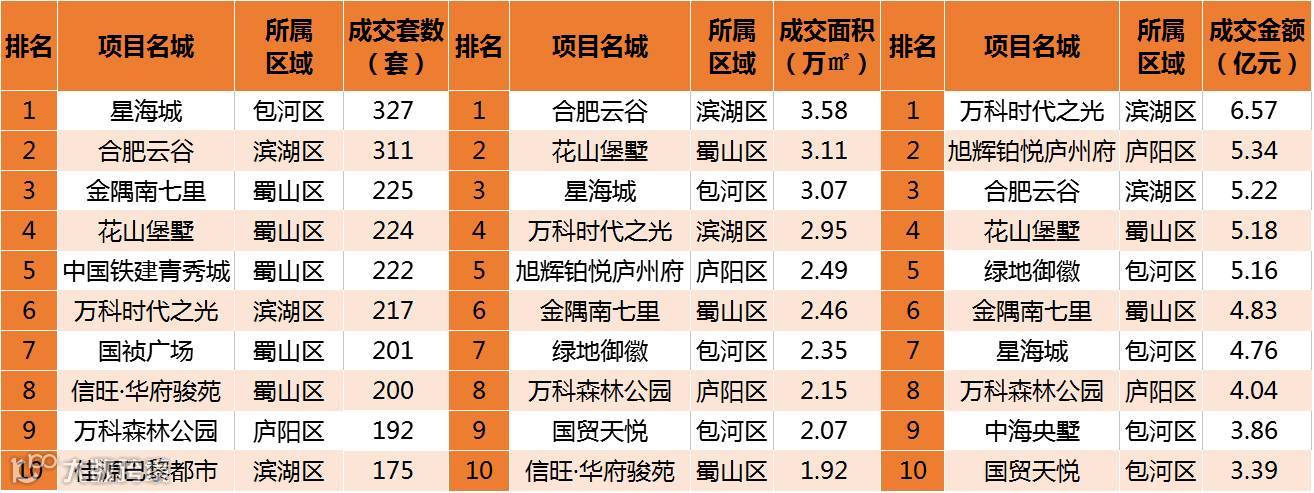 滨湖区的合肥云谷、蜀山区的花山堡墅和包河区的星海城分别以3.58万㎡、3.118万㎡和3.07万㎡的成交量位列成交面积前三;