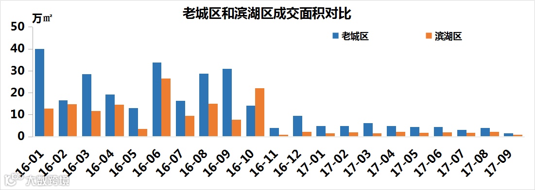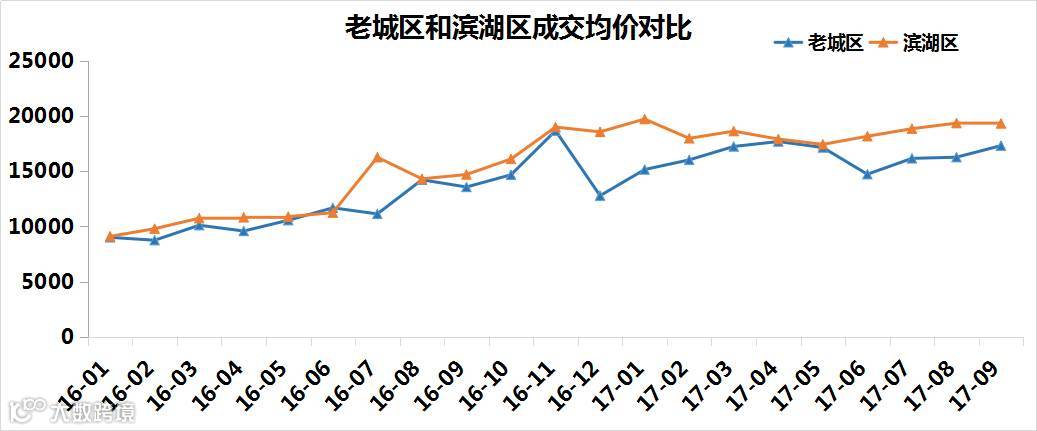 从成交均价来看,滨湖区的均价总体上都比老城区的高;老城区9月份的房价为17321.73元/㎡,环比涨6.44%;滨湖区9月的房价为19328.44元/㎡,环比跌0.16%。