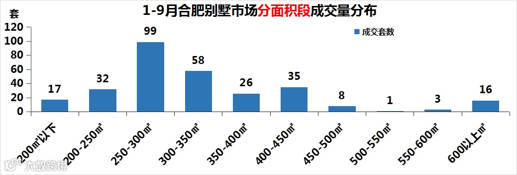从分面积段成交来看,1-9月合肥别墅市场以250-300平米的户型为成交的主力,共成交99套,成交套数占比33.56%;其次是300-350㎡的户型,成交了58套。