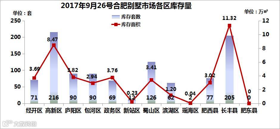 目前,高新区的别墅库存量最高,为216套/8.47万㎡,其次是长丰县205套/11.32万㎡;肥东县的库存为0。