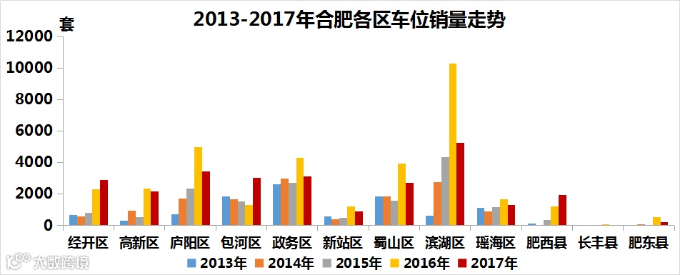 2017年,合肥共成交27006个车位,其中滨湖区车位成交套数占比占19.38%,销量居各区之首;政务庐阳区占比达12.69%,居第二;政务区成交套数占比为11.49%,排第三。