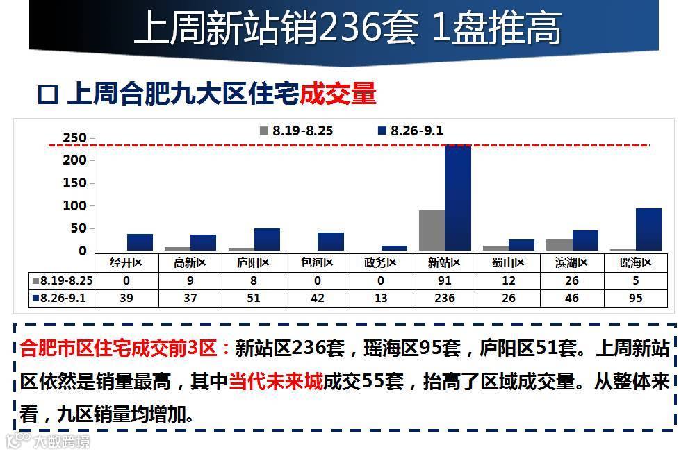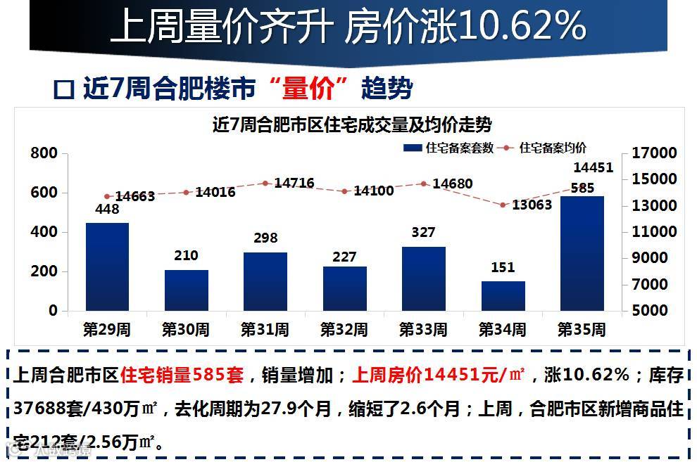 上周,合肥住宅市场整体呈“量价齐升”局面,房价环比涨10.62%;上周合肥市区住宅供应量大幅上涨,供应面积环比涨65.64%;上周市区备案套数也大幅上涨,其中新站区备案了236套,占市区备案套数的40.34%;上周商品住宅供销比减小至0.4,市场呈供不应求趋势;市区商品住宅库存减少,商品住宅去化周期缩短至27.9个月,库存压力较大。