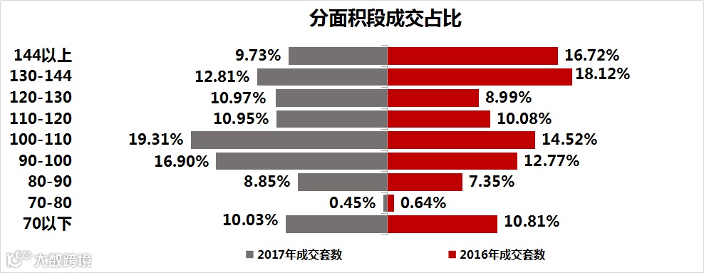 2017年,从分面积段来看,合肥均价1.5w-2w的商品住宅市场以90-110㎡的户型为成交的主力,成交占比36.21%,比2016年增加了8.92%。