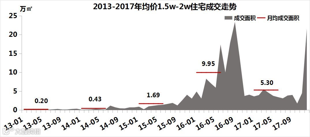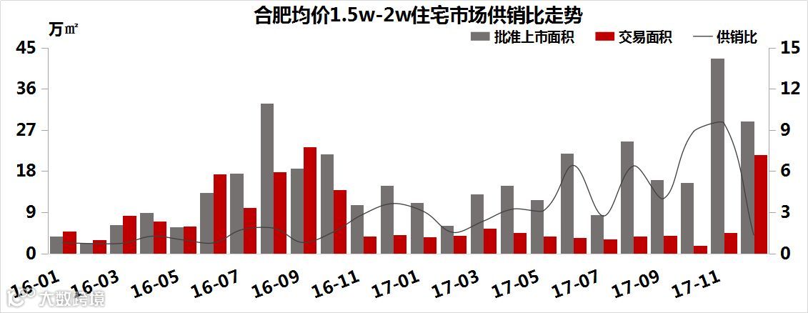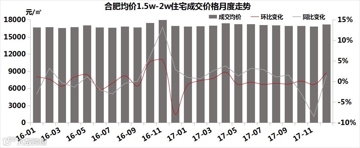 由于限购限价政策和分级备案等原因,合肥均价1.5w-2w的商品住宅成交量大幅减少,2017年月均销量为5.3万㎡。