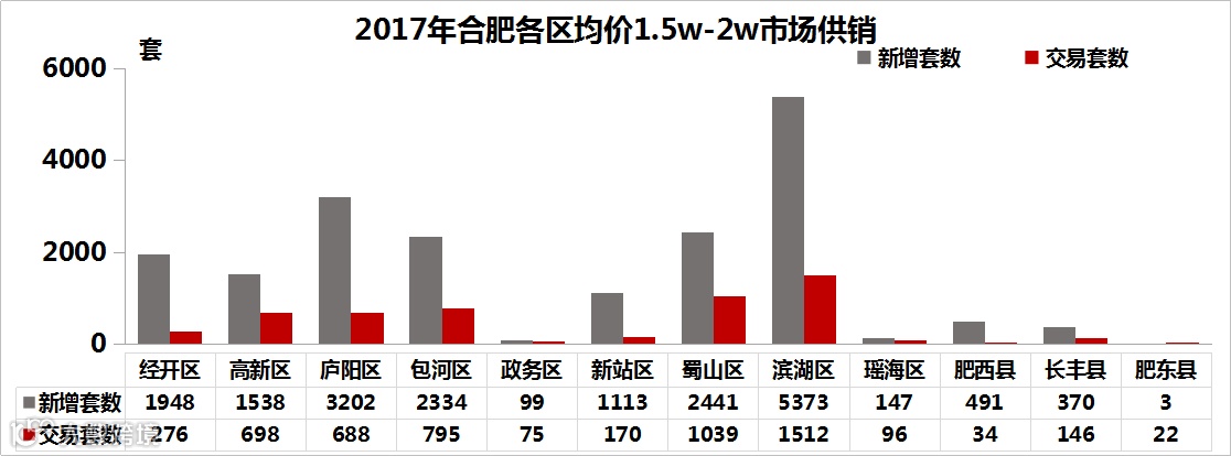 2017年,合肥均价1.5w-2w的住宅市场,新增套数前三的区域分别是滨湖区、庐阳区和蜀山区。