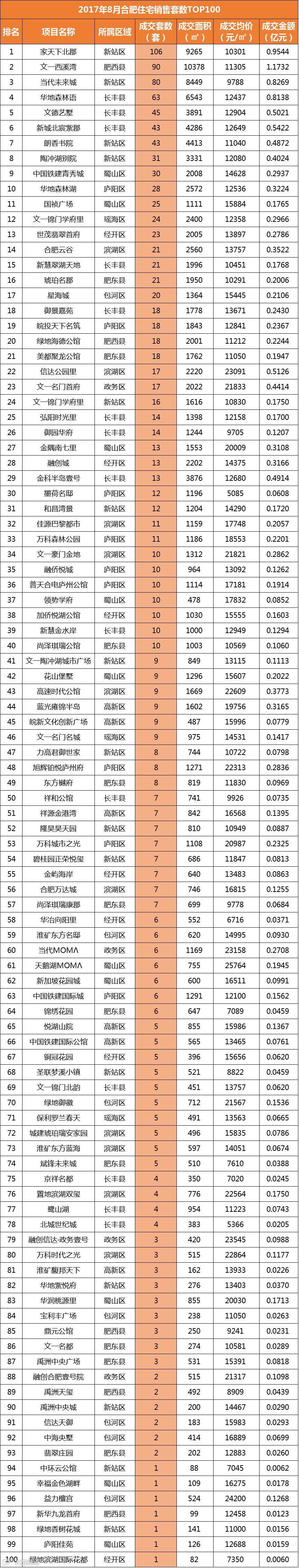 从销售套数来看,新站区的家天下北郡以106套进军TOP1;并且TOP10中新站区有4盘、长丰县进军3盘,销售套数TOP10中三县共占4席,其他两盘分别是蜀山区的中国铁建青秀城以30套排第九、庐阳区的华地森林湖以28套排第十。