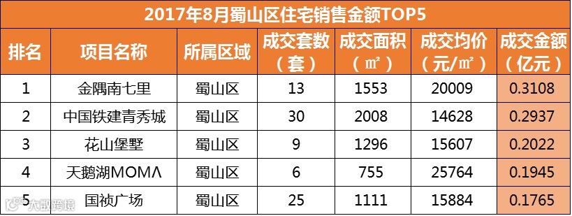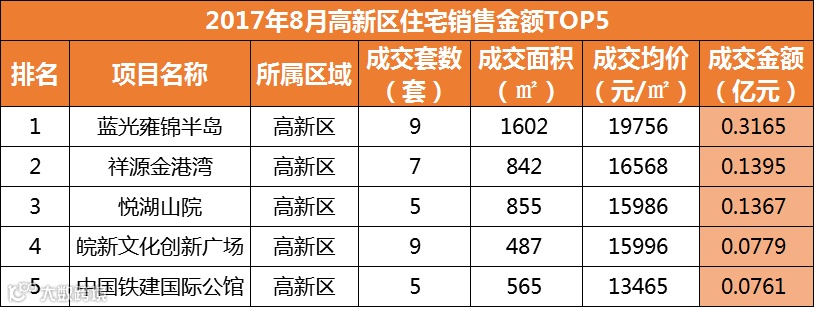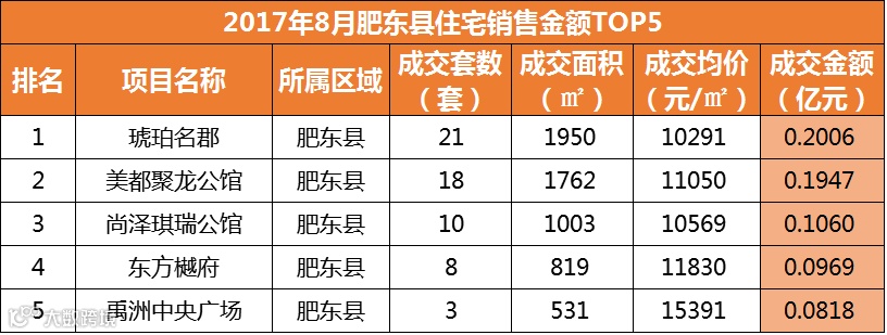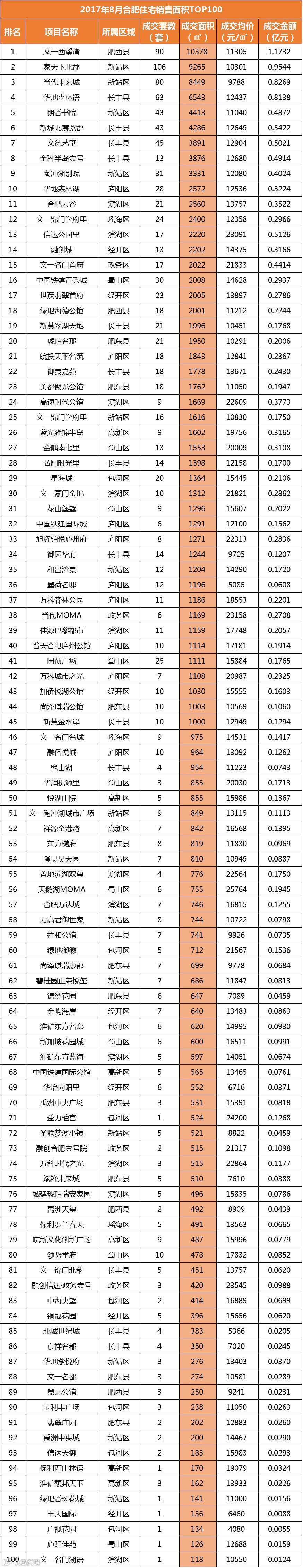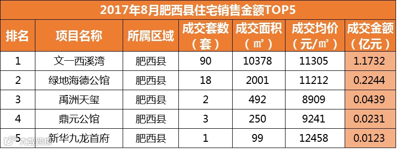 从销售金额来看,肥西县的文一西溪湾居成交金额排行榜榜首列,共计1.1732亿元;TOP10排名榜上,长丰县进军4盘,新站区3盘,肥西县1盘,剩下两盘分别是滨湖区的信达公园里和政务区的文一名门首府。