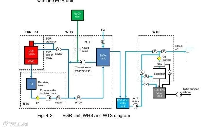 本轮的主机选择的曼恩能源公司的废气再循环技术。废气再循环是一种通过调整进气来减少氮氧化物排放的方法。废气的一部分在返回到扫气侧之前用水冷却和清洗。因此,峰值燃烧温度显著降低。但也有负面影响,安装废气再循环系统会降低发动机的燃烧效率,从而增加燃料消耗。此外,除了各种其他系统配置外,还需要一个水处理系统和氢氧化钠剂量装置来中和废气再循环装置中使用的水,然后排放。出水排放必须始终满足IMO MEPC 307(73),2018废气再循环排放指南,并与硫化物洗涤器洗涤水排放要求类似。