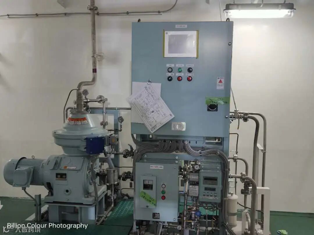 为水循环系统服务的还有一个WTS系统,冷凝水越来越多会导致缓存柜水溢流到放残柜,污水处理泵会根据放残柜中的水位启停。污水处理泵把水送进分水机,分水机分出来的杂志会驳进脏水柜,这个水柜的水要送岸回收。分水机分出来的干净水会进入一个吸附滤器,在滤器的出口有一路接到15ppm检测器,同油水分离器检测单元相似,当感知到油分超过设定值会自动把出口水送入放残柜。当油分没有达到设定值,会打开直接排海的管路,这样实现了整个系统的无污染处理。