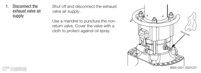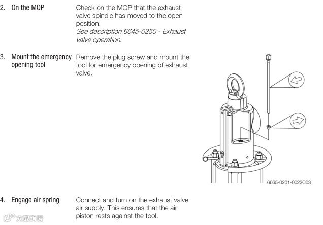 那么这个时候我们除了注意不喷油会导致排温偏差过大会出现SLOW DOWN外还要考虑应该怎么保持排气阀常开,排温偏差问题需提前在机舱报警系统AMS中将报警偏差提前设定好。排气阀只关掉空气弹簧气源,卸掉空气,由重力作用使排气阀阀杆自由下落打开排气阀,但在主机在运行时,受活塞上行影响,会导致排气阀阀杆上下运动,由于没有了压缩空气缓冲,很容易造成排气阀阀盘敲击损坏,显然这样做还不可取。所以厂家提供了一个专用工具,排气阀专用工具panel上125。