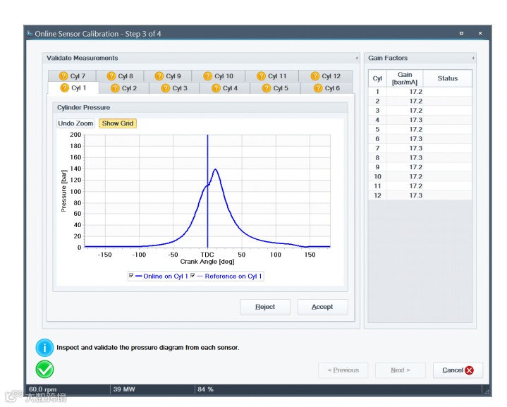目测每个缸的压力曲线,检查在线传感器测得的压力是否与参考传感器测得的压力曲线近似,且形势相同。检查增益因子表,比较每缸的增益因子,其值应该大致相同,如果增益因子与其他缸有明显偏差,应该拒绝该组测量数据。注意:如果示功阀未完全打开或有脏堵,可能使在线传感器与参考传感器产生较大的偏差,在这种情况下应重新测量。