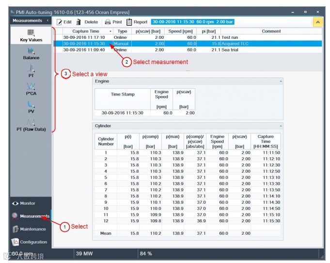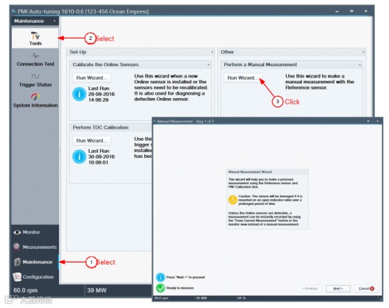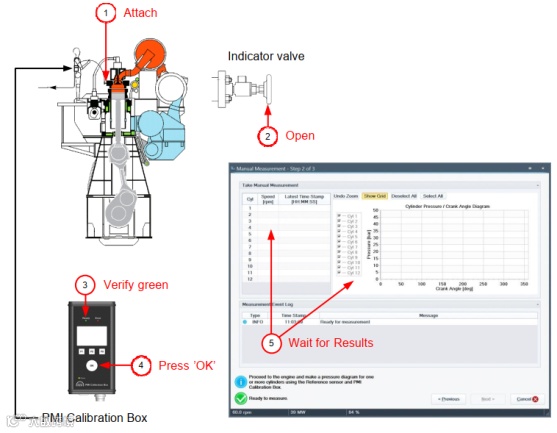 轮机员到机旁使用参考传感器和校准器对单缸或多缸进行手动压力测量,在向导的帮助下完成每一步测量过程,手动测量仅用于帮助排除在线传感器的故障。