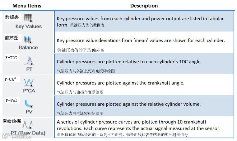 在线参数监视和查看,气缸压力数据为连续监视的,并可在监视窗口中实时查看。该菜单包含了由气缸传感器实时测量的实时数据的不同形态图,不同的形态图可以从屏幕左侧垂直列表栏选择,如下: