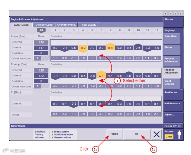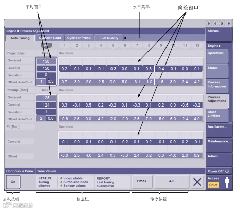 MOP B上的自动优调窗口显示了各缸之间的实际平均压力和压力偏差,如果这些值超过建议的偏差极限,将用不同颜色的图形表示。
