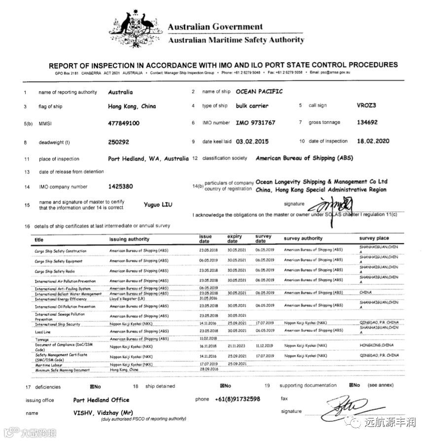太平洋轮PSC检查报告