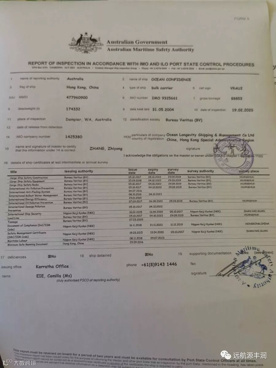 2020年2月19日,在刚刚结束的澳大利亚PSC检查中,由我司全套派员管理的OCEAN CONFIDENCE轮(信心轮)、OCEAN PACIFIC轮(太平洋轮)再创佳绩,双双零缺陷通过检查。在此前的1月30日,我司OCEAN TIDE轮(好势轮)同样以零缺陷的优异成绩通过了美国PSC检查!