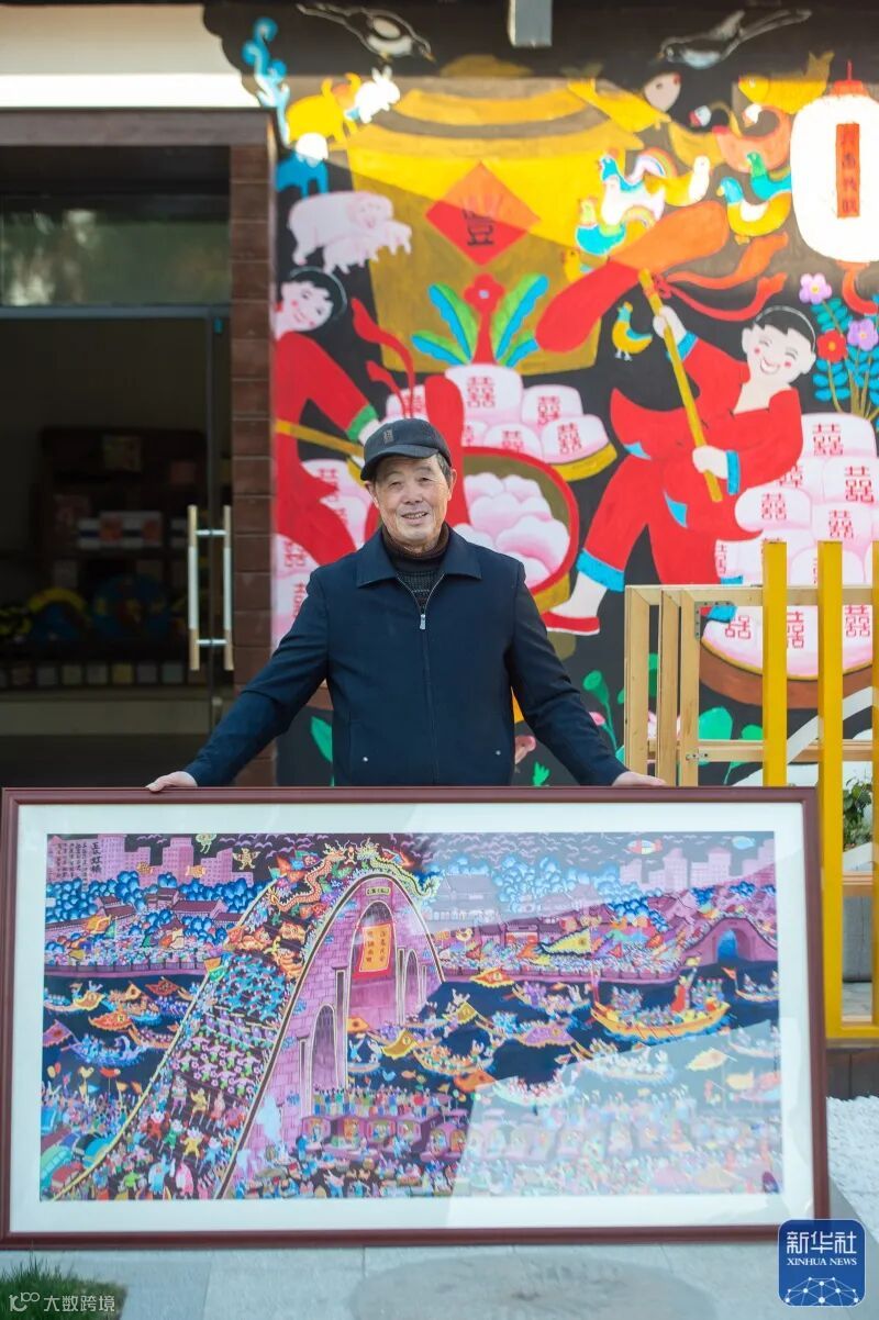 浙江省嘉兴市秀洲区油车港镇胜丰村村民张金泉与自己的画作《国泰民安》合影(2020年12月15日摄)。新华社记者江汉摄