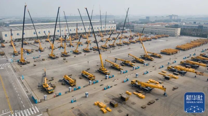 这是2019年4月4日在徐工集团徐州重型机械有限公司拍摄的调试中的起重机(无人机照片)。新华社记者李响摄