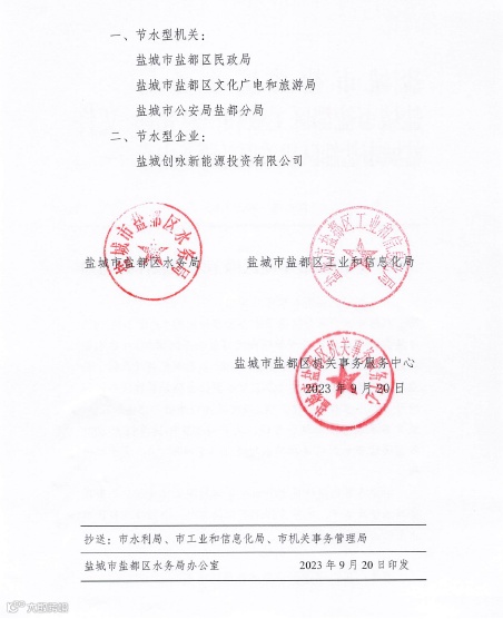 盐都区水务局、工信局、机关事务服务中心日前联合公布2022年度区级节水型载体评选结果,盐城创咏新能源投资有限公司榜上有名,荣获2022年度区级“节水型企业”。