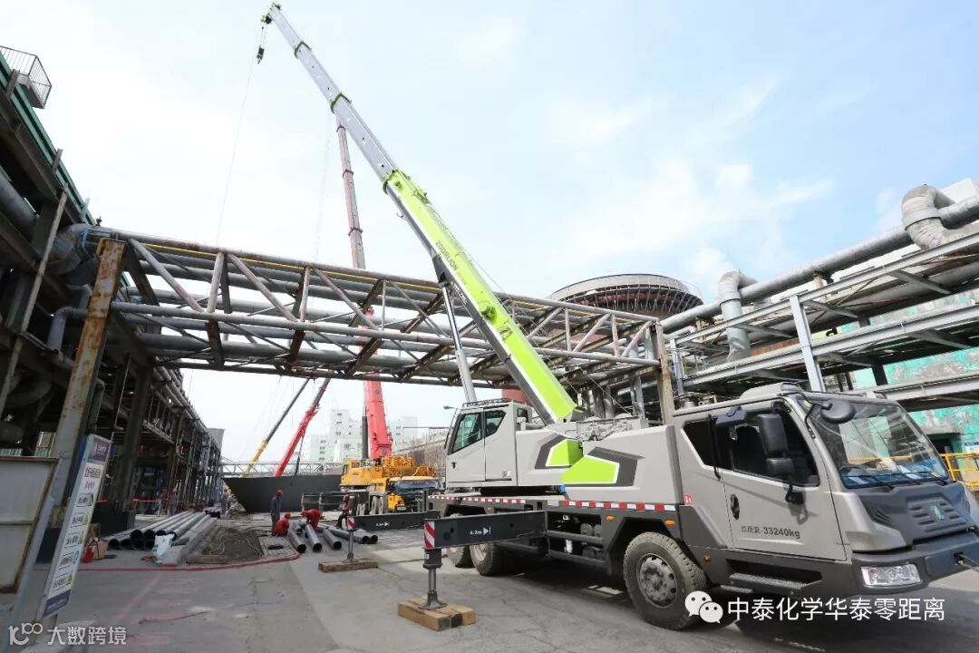 四辆大型吊车依次排开,正将一个直径约15米的锥体缓慢吊起,旁边施工作业人员正在进行管线的预制工作……..4月10日,在电解车间一次盐水界区,新增浮上桶项目正在紧张而有序的进行着。