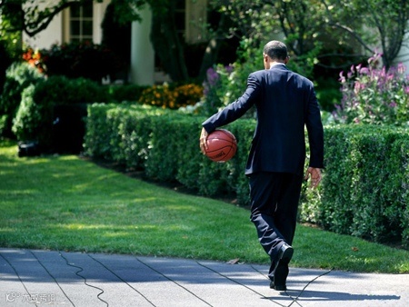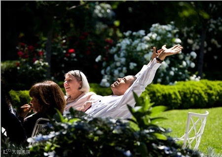 奥巴马与顾问们在玫瑰园开会,期间在午后的暖阳下伸了个懒腰。