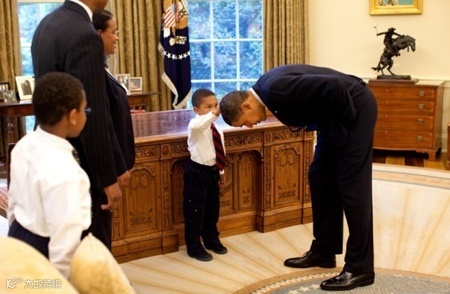 可是,奥巴马在孩子面前低下了骄傲的大头和傲人的身材。
