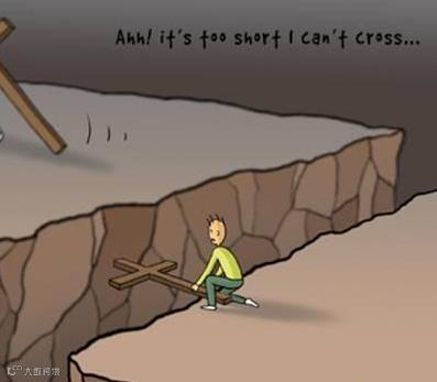 啊哈!谁料,前边忽然出现了一个又深又宽的沟壑!沟上没有桥,周围也没有路。也没有蜘蛛侠或者超人出来解救他…