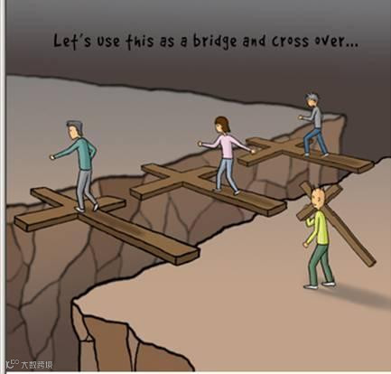 后面的人都慢慢地赶上来了,他们用自己背负的十字架搭在沟上,做成桥,从容不迫地跨越了沟壑。