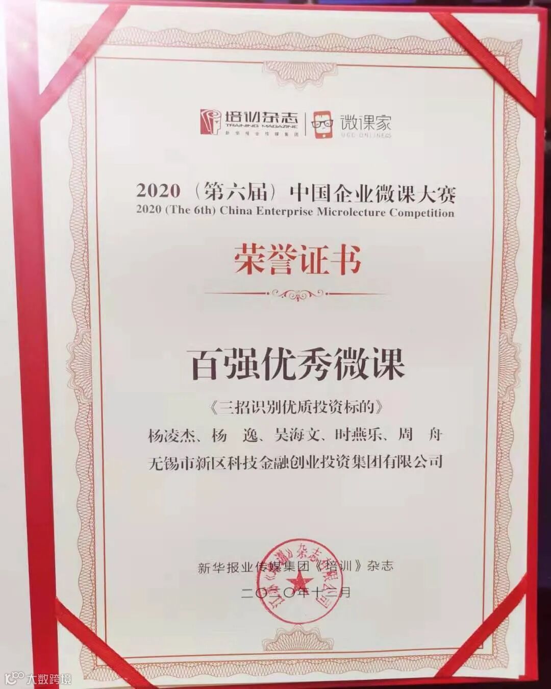 新投集团微课参赛作品“三招识别优质投资标的”从众多微课作品中脱颖而出,获全国“百强优秀微课”奖。在12月16日本届微课大赛无锡赛区颁奖典礼上,新投集团该参赛作品亦斩获无锡赛区的“优秀微课设计奖”。