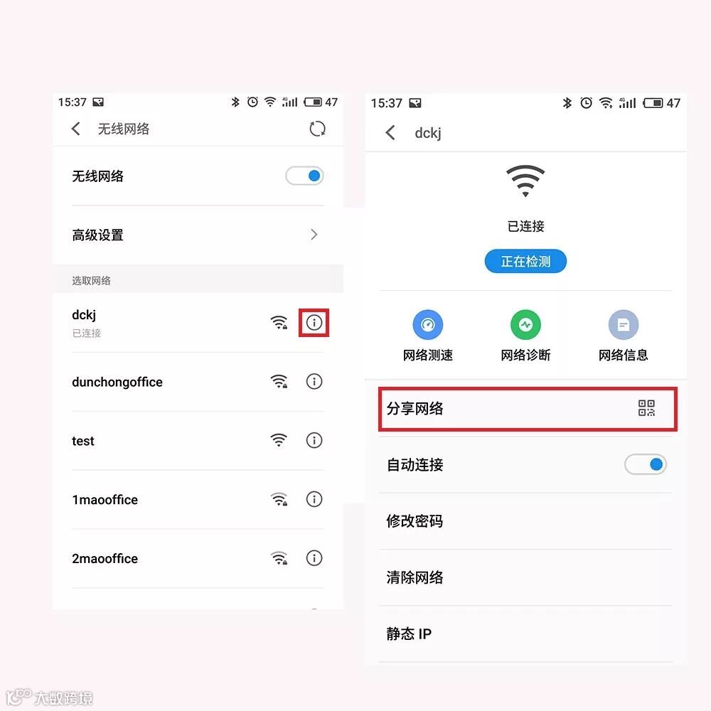 以下以安卓手机为例。点开设置,找到连接的Wi-Fi,将该网络以二维码的形式分享,截屏保存二维码图片,打开具有扫一扫功能的APP,如支付宝,扫描成功后,就可以看到该热点的密码。目前ios系统的手机无法通过分享二维码形式查看Wi-Fi密码。