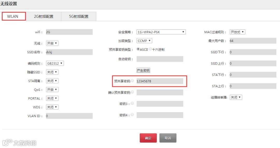 点击“WLAN”配置页面,在“预共享密码”配置栏中可看到当前SSID的密码。