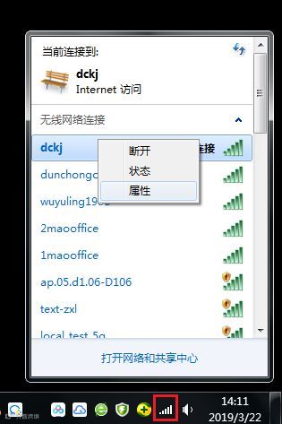 以下以WIN7系统为例。如果在电脑上有连接过该热点,想查看该热点的密码,我们可以点击电脑桌面右下角的“网络连接”图标,选择想要查看的热点,鼠标右击,选择“属性”。