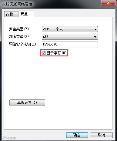 在弹出的无线网络属性中选择“安全”,勾选上“显示字符”,在网络安全密钥栏就能看到Wi-Fi密码。